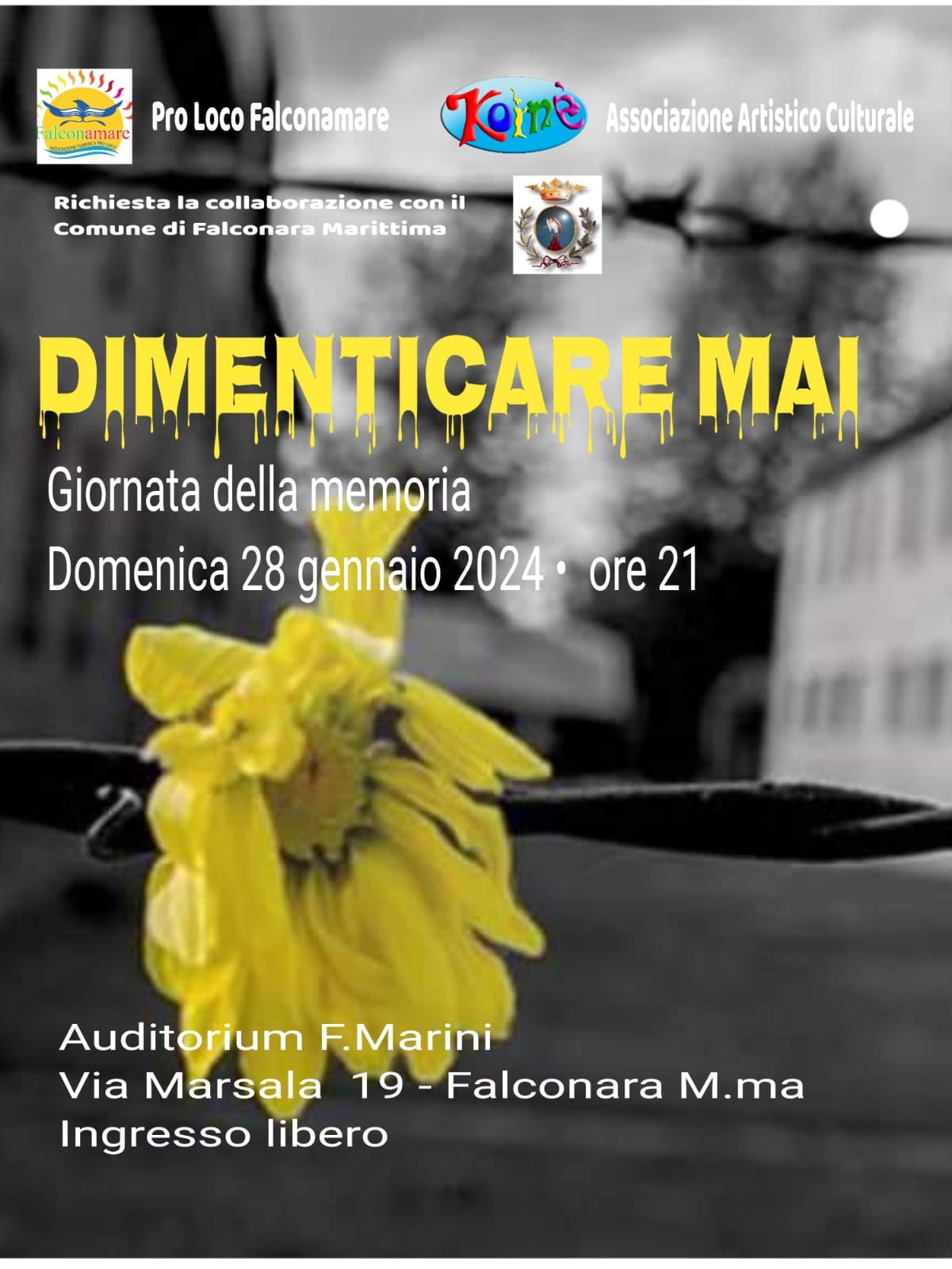 Domenica 28 gennaio ore 21.00 Auditorium "Marini" Via Marsala 19 "Dimentica mai" A cura di associazione Koiné e Pro Loco Falconamare