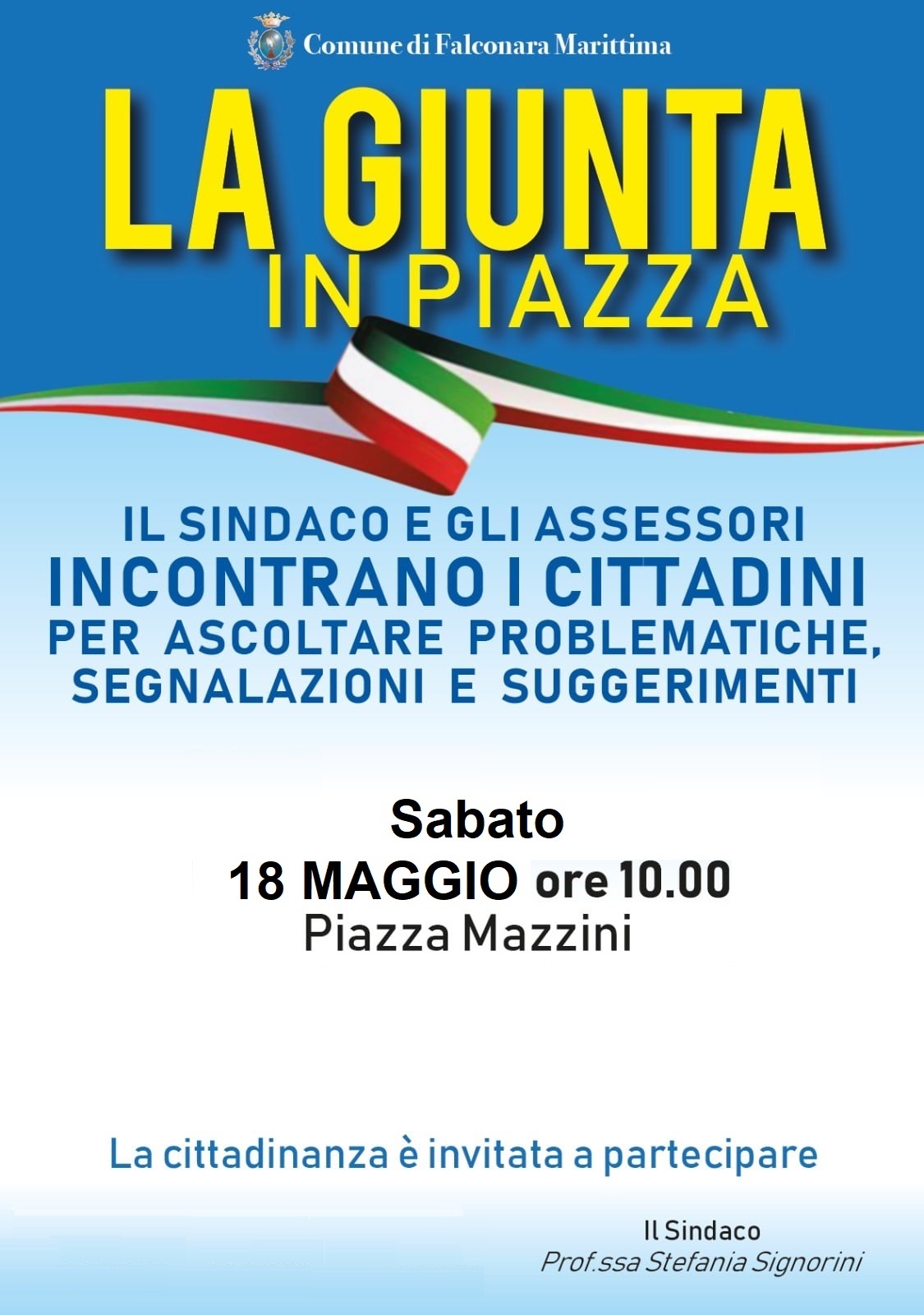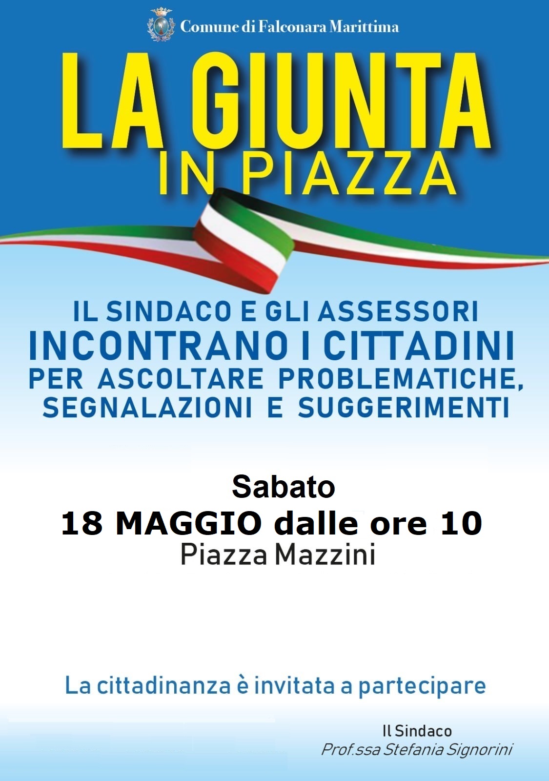 Ripartono sabato 18 maggio da piazza Mazzini gli appuntamenti con la 'Giunta in piazza', occasioni per incontrare di persona il sindaco e gli assessori. Gi amministratori comunali si confronteranno con i cittadini e ne ascolteranno problematiche, segnalazioni e suggerimenti.