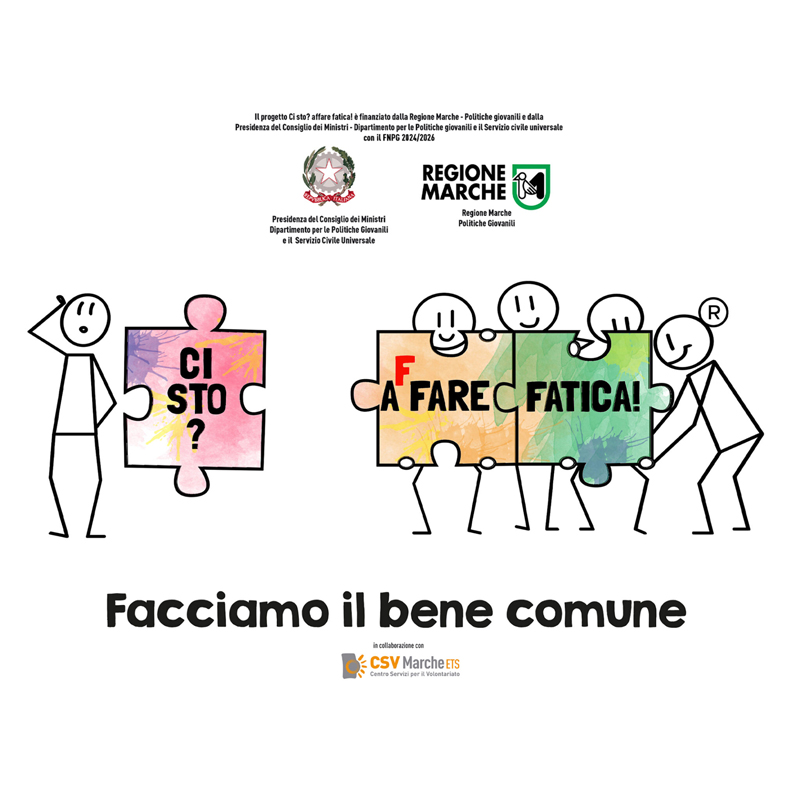 Il progetto coordinato dal CSV Marche Ets è finanziato per l’annualità 2025 da Regione Marche-Politiche giovanili e dalla Presidenza del Consiglio dei Ministri Dipartimento per le Politiche giovanili e il servizio civile universale con il FNPG 2024/2026.